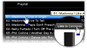Seleccione el botón "Lista de Canciones" del menú de la parte superior, se desplegará una lista con todas las canciones posibles a escuchar luego posesione el puntero del mouse en el título de la canción deseada ésta se tornará de color azul y simplemente seleccione el tema de su preferencia tal como se muestra en la figura de la derecha, éste comenzará a reproducirse de forma inmediata. |