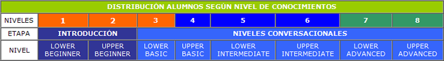 | Las clases son presenciales con profesor, alumnos divididos según nivel de conocimientos (ver tabla): |